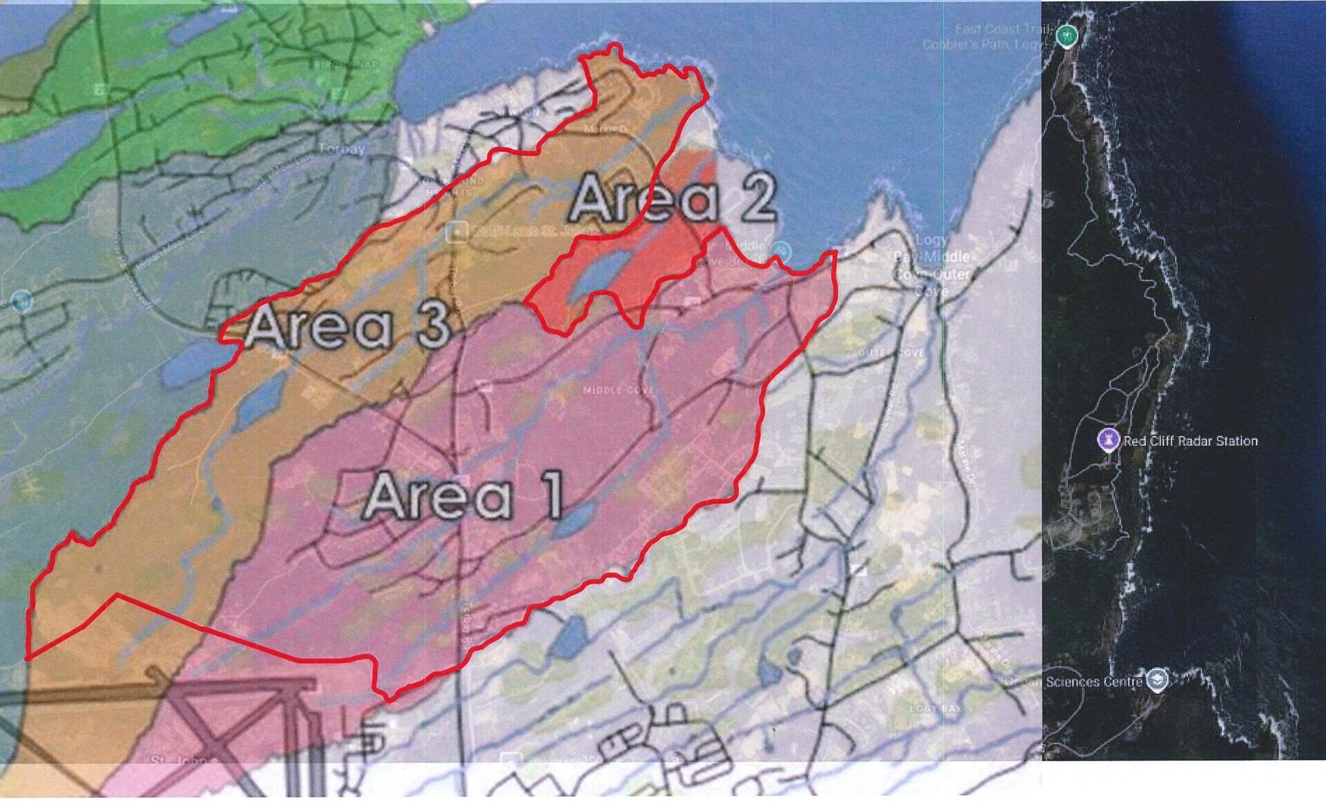 The proposed class action is brought on behalf of all persons owning and/or residing on or after January 1, 2024 at real property in the area within the Town of Torbay and the Town of Logy Bay–Middle Cove–Outer Cove, Newfoundland and Labrador northeast and down-gradient from the contaminated fire-fighter training site, which area is comprised of the Kennedys Brook and South Pond catchment areas identified in a groundwater flow modelling study prepared by the Town of Torbay’s consultant environmental engineers, the boundaries of which are demarcated by the red lines on the maps below (the “Impacted Area”).